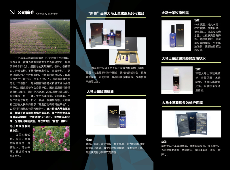 “新曹”牌大馬士革玫瑰系列產(chǎn)品:我公司與上海愛伽儷日用品公司聯(lián)姻,生產(chǎn)出“新曹”牌大馬士革玫瑰面膜、精華液、純露、復方精油系列化妝品。新曹香料人始終堅持產(chǎn)品高起點、高品質(zhì),工薪階層價格定位,深受北京、上海、廣東、深圳等一線城市消費者喜愛。