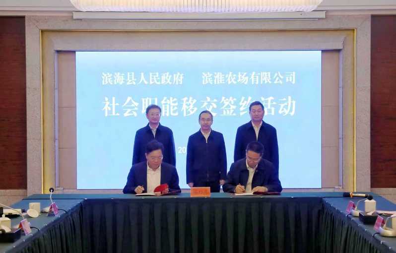 10月24日上午,濱淮農場社會職能移交簽約活動在濱海舉行。集團黨委書記、董事長吳本輝,濱海縣委書記吳啟標,集團黨委委員、副總經理劉衛華,總經理助理姚海洪,濱海縣副縣長李品出席簽約活動。濱海縣政協主席王海榮主持活動。吳本輝表示,推進企業辦社會職能改革,是新一輪國企改革的重要接續工作。濱淮實現農場辦社會職能移交屬地管理,是雙方互信互利互贏的重要成果,也標志著墾地融合發展邁出堅實步伐。濱淮農場要切實強化責任意識,加強與濱海縣委、縣政府的溝通匯報,有力有序推進各項社會職能的移交工作。吳本輝指出,近年來,濱海縣錨定經濟指標“總量靠前、增幅領先”、總體位次“沖刺全市第一方陣”的目標,以滿格狀態主動作為、勇挑大梁,持續放大區位、產業、資源、生態等優勢,經濟社會發展呈現出高歌猛進、勢頭十足的良好態勢。當前,江蘇農墾正在深化落實“三大建設”,全力支持所屬農場融入地方發展,培育壯大特色產業。希望以此次簽約為契機,進一步發揮墾地產業鏈協同優勢,推動資源高效整合、深度融合,共同培育特色鮮明的農業產業集群,打造墾地融合的“濱海樣板”,為推動沿海地區高質量發展、助力江蘇農業現代化走在前作出新的更大貢獻。吳啟標代表