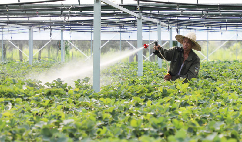 7月9日,三河農場農業科技示范園工作人員對草莓苗開展降溫除濕、打藥、打老葉等工作。