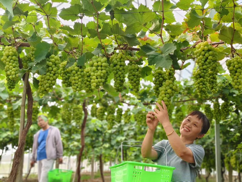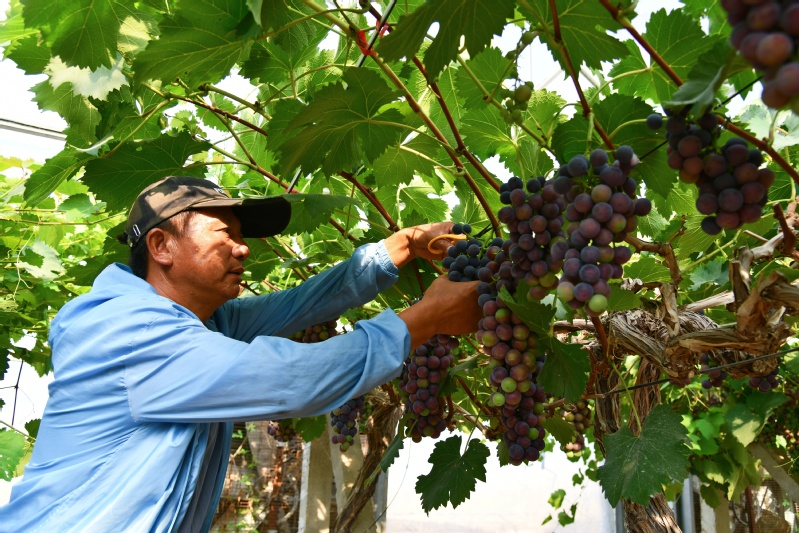 7月21日,走進淮海農場葡萄園,工人們正給訂貨客戶采摘葡萄。園區種植夏黑、陽光玫瑰、甬優等品種,隨著葡萄逐步成熟,訂貨客戶源源不斷。