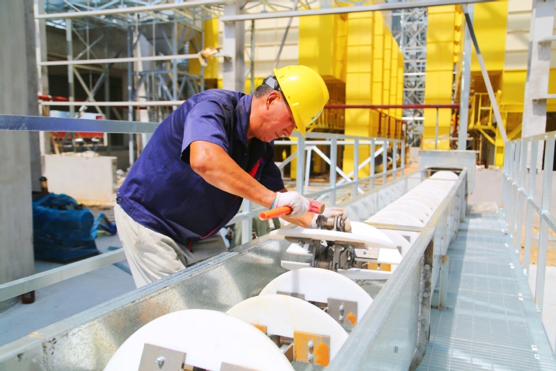 烈日炎炎,崗埠農場一線建筑工人在1200噸糧食烘干線建設現場頂著高溫進行焊接、組裝等作業,堅守崗位,全力保障項目如期完工。