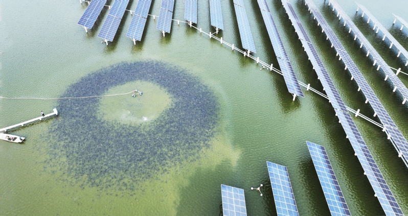 7月21日,俯瞰東辛農場光伏塘口,水面上成群的魚爭食,呈現“上有光伏發電,下有魚蝦歡騰”的生態生產圖景。