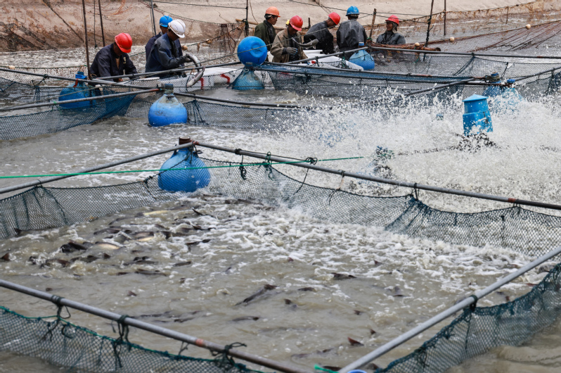 春放秋捕,共話豐收。走進崗埠農場公司南漁場的鯉魚養殖基地,一條條肥美的鯉魚不斷躍出水面,引起水花四濺。8月29日,崗埠農場公司水產養殖中心迎來鯉魚“大豐收”,養殖基地內熱鬧開捕秋天第一網鯉魚。初秋的早晨已然涼意十足,早上不到6點,天剛蒙蒙亮,捕撈人員就來到魚塘開網起魚。在水產公司工作人員的指揮下,一張巨大的漁網隨著捕魚工人的移動緩緩張開,大家不顧冰冷的水下溫度,緊張忙碌了起來。經過鋪底、收網、聚攏等環節的共同協作,漁網被慢慢升起……整個現場一片繁忙熱鬧景象。經過近三個小時的忙碌,在大家的精心分揀下,裝滿魚的筐子被吊車有序吊起,稱重、記錄、放魚一氣呵成。“這個吊車頂部的黃色圓塊就是電子秤,吊起魚的同時,秤上的信號就發到這個無線接收裝置上來,秤重既方便又精準。”現場記賬的方正解釋說。“看這些魚,品相好、質量高,抓都抓不住,活蹦亂跳的,真是大豐收啊!”起魚的工人們雖然全身都已濕透,但是看著手里的大魚,臉上洋溢著收獲的笑容。據悉,本次捕撈的鯉魚名叫“福安鯉”,在春季投放,采取訂單式捕撈銷售。當天,2.2萬斤“淮河牌”福安鯉被送上等候已久的運輸車,銷往本省徐州市及河南省等地。“養殖中心依托豐富水
